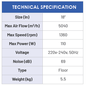 Extremely high air volume due to its large fan size at 5040m3h - Commercial & industrial grade